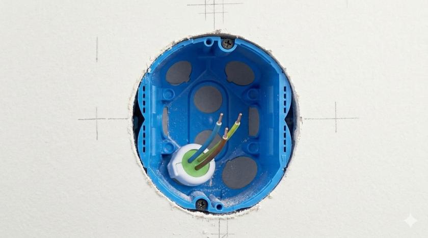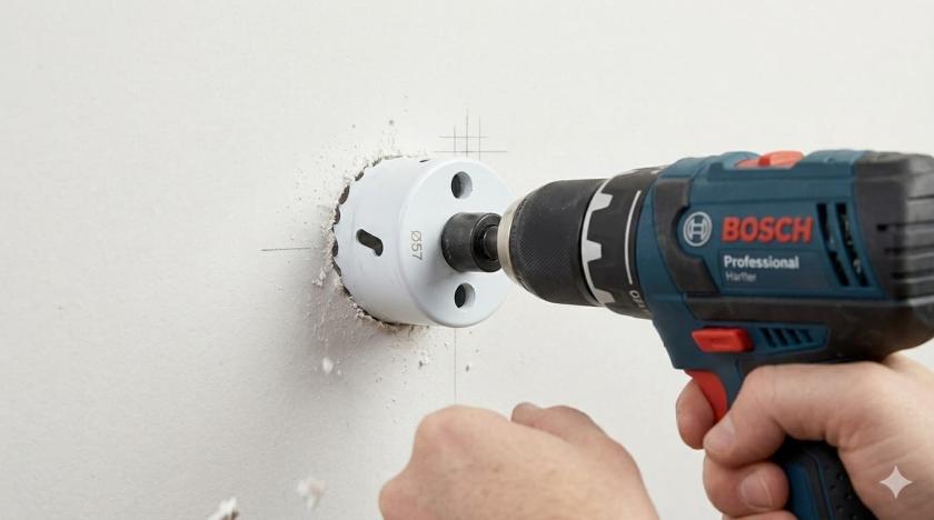 Når placeringen er markeret, bores hullet i gipsen. Til LK FUGA AIR bruges hulsav Ø57, og det er vigtigt, at hulstørrelsen passer præcist. Er hullet for stort, kan dåsen få svært ved at sidde fast. Er det for lille, bliver monteringen unødigt besværlig.