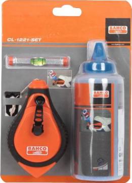 Bahco kridtsortiment CL-1221-SET ? Bestående af 3 dele: kridtsnor, kridt og snorvaterpas. Bahco kridtsnor: ? Længde 30 meter. ? Indvendig kammer der rummer 50 gram kridt. ? Indbygget gear med 3x hastighed gør tilbagespoling lettere. ? Forsynet med klo og krogende. ? Line af nylon/bomuldsblanding der tåler en max. belastning hele på 16 kg. Bahco blåt kridt: ? Mængde 227 gram. ? Med påfyldningsstuds der sikrer at spild undgåes. ? Flaskerne er forsynet med skala, der informerer om kridtets tolerence overfor fugt (hvor længe stregerne er synlige). Bahco snorvaterpas: ? Længde 7,5 cm. ? Magnetisk. ? Forsynet med én libelle.
