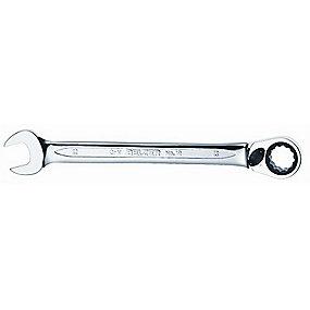 DIN 3113/ISO 3318 Finish: Smedet, forniklet og forkromet, højglanspoleret. Materiale: KROM VANADIUM Ring-skraldenøgle med skraldefunktion i ringen og med omskifter for hurtig ændring af højre og venstre omløb. Skralde med 72 tænder og 5° arbejdsvinkel, 15° vinklet hoved. Med Dynamic-Drive profil. SB-pakning.''