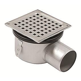 Blücher Square gulvafløb med vandret Ø75 mm afløb. Til beton & fliser. Rustfrit stål