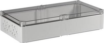 Montagekasse 300x600x132 mm, grå med transparant låg, metriske udslagsblanketter, 8xM12/20 + 5xM16/25 + 12xM12/20 + 1xM32/40