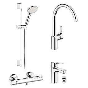 Damixa Core Home køkken + bad: Køkkenarmatur, håndvaskarmatur med bundventil med klik-funktion, brusesæt og Thermixa Zero termostat. Krom.