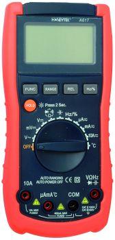 Robust multimeter med oplyst display og LED-lampe for måling i trange og mørke rum. Med diodetest, kontinuitetstest, pulskvotemålning, automatisk områdeindstilling. Datahold, relativ måling, automatisk slukning. CAT III 600V, CAT II 1000V.