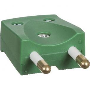Hanstik 250V flad, uden jord, fiberforstærket plast, grøn. Anvendes til montage på ledning. Passer til runde hunstik. Er forsynet med isoleret aflstningsbøjle for ledning Ø 2,5-10 mm. Er forsynet med isolerede stikben. Spænding: 250V. Belastning: 16 Amp. Materiale: Ekstra forstærket plast.
