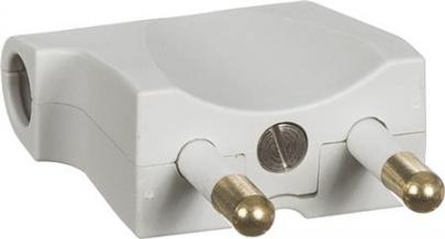 Hanstik 250V flad, vinkel, uden jord, (2 styk) Anvendes til montage på ledning Passer til runde hunstik. Er forsynet med labyrintaflastning for ledning rund max 6,5mm eller flad max 4 x 6,5 mm. Er forsynet med isolerede stikben. Spænding: 250V. Belastning: 16 Amp. Materiale: Slagfast nylon.