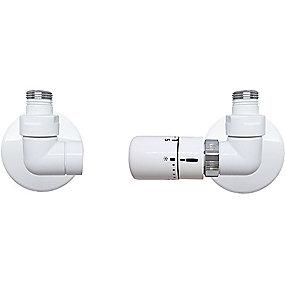 Corner ventilsæt med rumtermostatføler, 12" vinkelløbende, hvid.Ventilsættet er inkl. føler, 12" tilslutningsrør samt rosetter til væggen – alt i et varenummer.OBS: fremløb er samme side som rumtermostaten sidder. Termostatføleren skal altid pege mod venstre.Ikke vendbar.