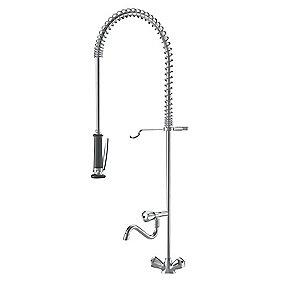 Kraftig kvalitet til det professionelle storkøkken.Forkromet 2 grebs med forbruseren ophængt i kraftig fjeder og kraftig slange. Der er integreret soft close i spulebruseren for at undgå trykstød i vandrørene. Tudens fremspring er 250mm ude, og udløbet 182mm over bordpladens højde. Totale højde på slangens krumning er 1100mm, og forbruseren stikker 400mm ud fra armaturets krop og svæver 375mm over bordpladens højde.