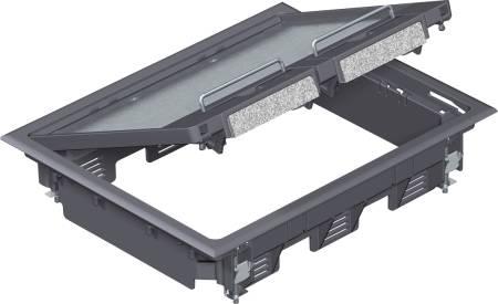 Til lågindsats GES6U, passer 3 stk GB2 dåser. Dette gør at der sættes op til 9 moduler OBO Bettermann mosteringsmateriel. Den kan enten sættes i en indstøbningsboks med den rette montageplade eller sættes direkte i et hævet gulv. Gulvtykkelse 5mm.