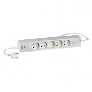 LK 5-Stikdåse uden jord, med 2xUSB, med afbryder og 1,5 meter ledning, hvid/alu