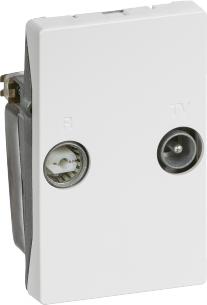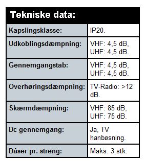 Forsynet med 2 IEC-nomerede udgange for R og TV. Har indbygget R/TV filter, er HF-tæt. Udtagene har lav dæmpning og god filtervirkning.