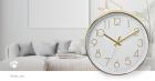 Dette runde Nedis®-vækkeur kombinerer enkelthed, stil og letlæselige, store tal og fremhæver guldfarvede karaktertræk mod en hvid baggrund.