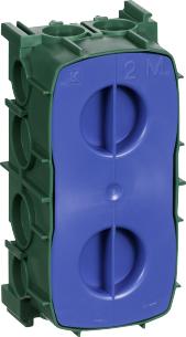 Indmuringsdåse, 2 modul Til indmuring i blanke eller pudsede vægge af mursten, gasbeton m.v. Ved montering af flere indsatse i 2 - og 21/2 modul dåser, skal dåserne monteres med skillestykke. Fremstillet i termoplast med stor formstabilitet. Ved sammenbygning af dåser, hvor rammer skal stødes, skal afstandsstykker imellem dåserne anvendes. Er forsynet med ribber henholdsvis skydespor for sammenbygning. Har en dybde på 49 mm og kan indbygges ryg mod ryg i en 100 mm væg. Rørtilgange: Hver ende har 2 stk. 16 mm, siderne 2 x 16 mm + 2 x 20 mm og bunden har 2 x 16/20 mm.