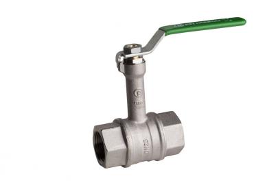 Kraftig kuglehane med lang hals og fuldt gennemløb. TEA overfladebehandling. Muffe/muffe. Grønt stålhåndtag.