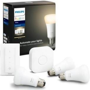 Hue Starter kit bestående af 3x E27 Hue White pærer (9,5W LED, 2700K blød hvid, levetid 25.000 timer, 806 lumens), Hue Bridge 2.1 samt Dimming Switch, Pærer kan styres via Bluetooth App eller Hue Wireless Dimmer, for fuld funktionalitet kræves en Hue Bridge(medfølger), styres via din smart-enhed, understøtter Apple HomeKit