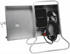 Ladeboks indbygget i låsbart skab af elforzinket stål. Skabet kan hænges på væg eller stilles på jorden. Foldeben gør den nem at opbevare. 2 m tilslutningskabel med stikprop 416-6 både på 1-faset og 3-faset model. Laderen er fastlåst på bagstykket ved hjælp af den medfølgende hængelås. Ladeboksen har indbygget elmåler til visning af forbrugt strøm. Indbygget fejlstrømsrelæ af type A med DC-lækagebeskyttelse 6mA, modsvarende Type B fejlstrømsrelæer. Tydelig indikation af ladning via LED-lampe i fronten. Trykknap på siden for valg af ladestrøm (6, 8, 10, 13, eller 16A) ved start af ladning. 6 m ladekabel med ladestik type 2.