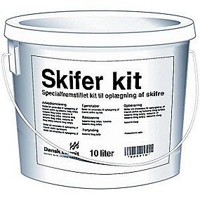 Skifer kit anvendes til oplægning af Eternit skifre, og kiningen udføres med spartel eller trykluftsprøjte.Skifer kit bør kun anvendes udendørs på tørre skifre, og bedste anvendelsestemperatur er 15-20 gr. Egenskaber:Skifer kit er en plastisk kit fremstillet på basis af bitumin. Forbrug:1 liter kit rækker til ca. 13 stk. Eternit 30x60 cm skifre.