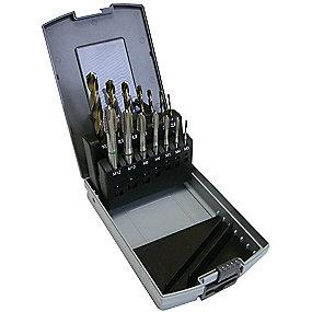 Alias Pro 310120 E SET. Med spiraltappe i koboltlegeret high-speed Stål og bor i koboltlegeret special stål. Tappe str. M3, M4, M5, M6, M8, M10, M12 og spiralbor i str. 2,5, 3,3, 4,2, 5,0, 6,8, 8,5, 10,2 mm. I drillbox kassette.