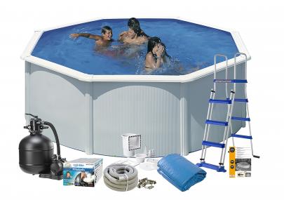 Kraftig galvaniseret stålvægspool fra Europas største producent GRE, som leveres komplet med effektivt og professionelt filtersystem samt skimmer. Stålvæggene er multibehandlede, hvilket betyder, at de er galvaniserede, fosfaterede, primet og lakeret for at kunne modstå det nordiske klima.