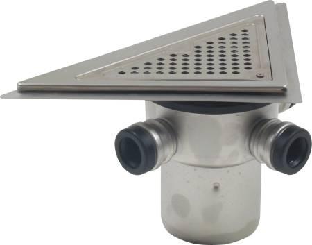 BLÜCHER Drain Triangle - Justerbar trekantafløb for montering mod væg i beton- og klinkegulve, med sideindløb og lodret Ø110mm udløb, med membranflange.